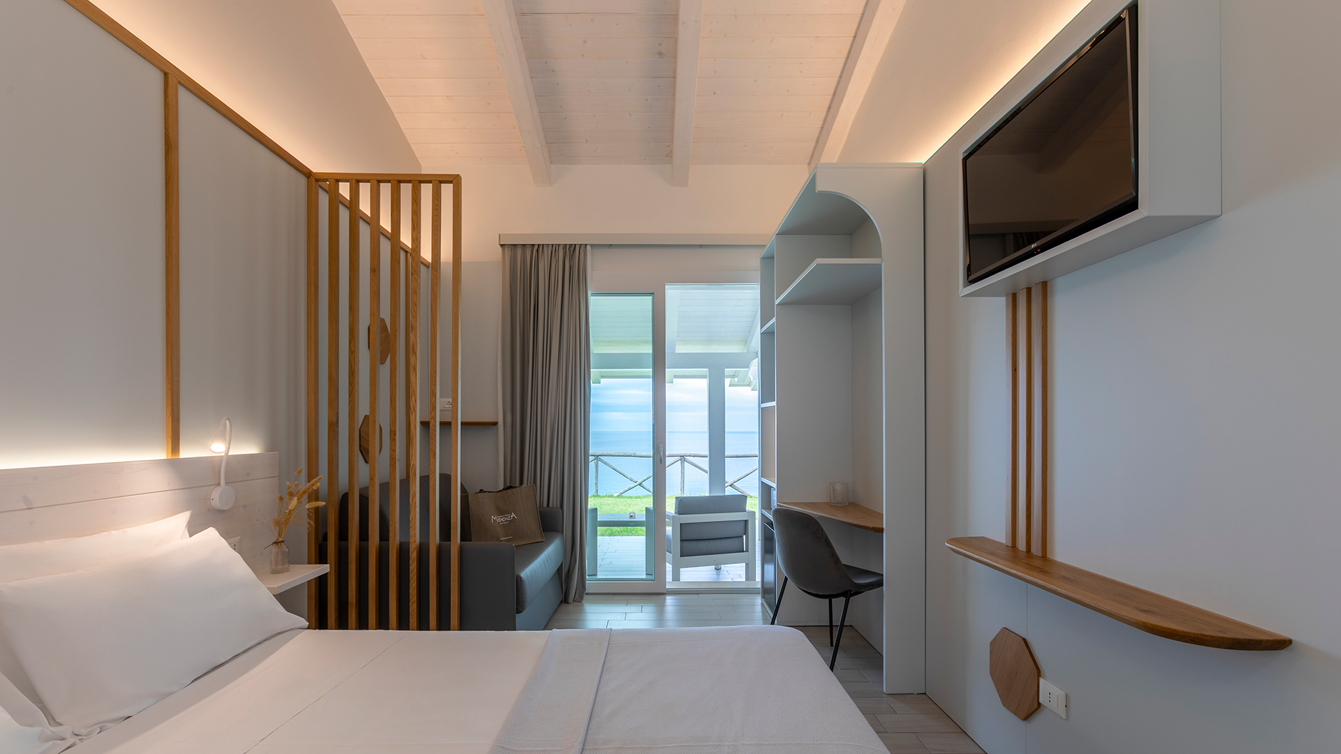 The Executive Suites with sea view are located in a small structure with 6 units set side by side. They are new and spacious, have a minimalistic and contemporary style, with white solid wood furniture, very high ceilings to allow natural cooling and are equipped with every comfort.