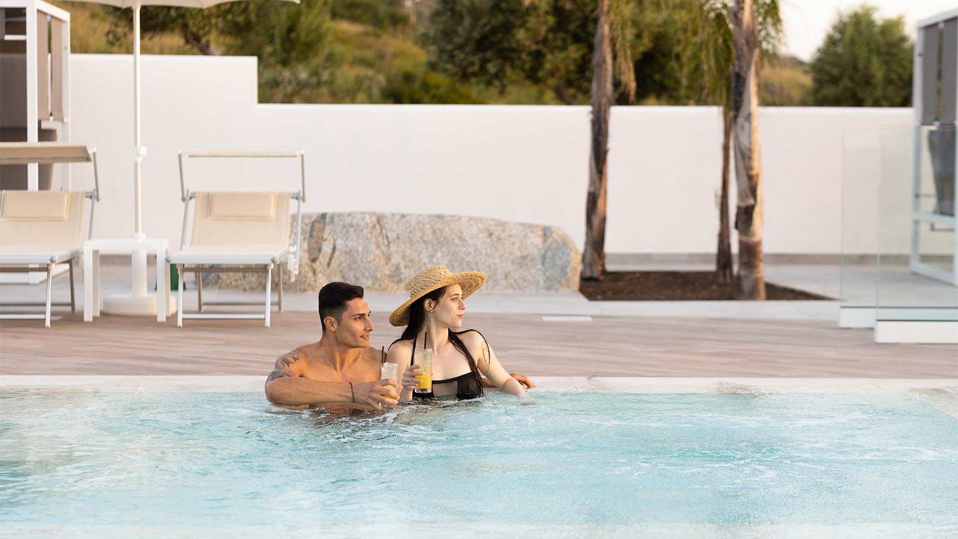 In our sea view pool you will find a hydromassage area, a waterfall and geysers to give you a delicate wellness massage. The pool water is heated for maximum comfort even on less warm days.